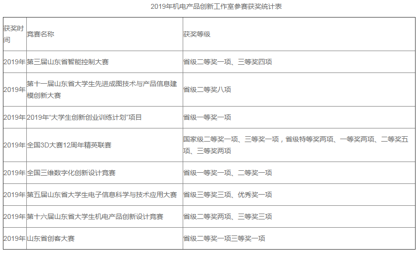 近几年,以王海艳老师为首的机电创新工作室导师团队指导工作室学生参加“山东省机电产品创新设计大赛”和“全国大学生机械创新设计大赛”等相关科技创新大赛,取得了较好成绩。2013年获得山东省机电产品创新设计大赛一等奖一项;2013年山东省大学生机电产品创新设计竞赛获山东省一等奖;2014年获得山东省机电产品创新设计大赛一等奖一项,二等奖一项,三等奖两项,优秀奖一项;2014年山东省大学生机电产品创新设计竞赛获山东省一等奖;2014年山东省大学生机电产品创新设计竞赛获山东省二等奖;2014年山东省大学生机电产品创新设计竞赛获山东省三等奖;2014年山东省大学生机电产品创新设计竞赛获山东省三等奖;2015年获得山东省机电产品创新设计大赛二等奖一项,三等奖一项,优秀奖一项;2015年山东省大学生机电产品创新设计竞赛获山东省二等奖;2015年山东省大学生机电产品创新设计竞赛获山东省三等奖;2015年山东省大学生机电产品创新设计竞赛山东省优秀等奖。2016年获得山东省大学生机电产品创新设计竞赛三等奖两项,优秀奖一项;2017年获得山东省大学生机电产品创新设计竞赛三等奖三项;2017年获得全国三维数字化创新设计大赛二等奖三项,三等奖一项;2018年获得山东省大学生机电产品创新设计竞赛三等奖三项,二等奖一项;2018年获得山东省智能控制大赛一等奖一项,三等奖一项;2018年获得全国三维数字化创新设计大赛国家级二等奖两项,省级特等奖两项,一等奖三项,二等奖八项,三等奖两项;2018年获得山东省大学生先进成图大赛二等奖三项;2018年获得山东省齐鲁机器人大赛二等奖四项;2018年获得山东省高校机器人大赛二等奖三项,三等奖两项;其中2019年的成绩尤其突出,获奖统计如下。
