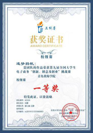2019年7月15日,第九届全国大学生电子商务“创新、创意及创业” 挑战赛青岛黄海学院最佳创意奖