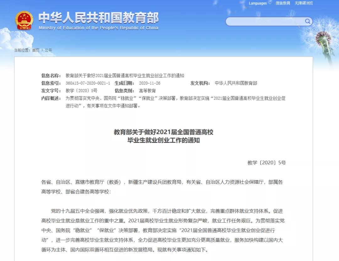 近期,教育部发布关于做好2021届全国普通高校毕业生就业创业工作的通知。通知指出,树立正确用人导向。推动党政机关、事业单位、国有企业带头扭转“唯名校”“唯学历”的用人导向,在招聘公告和实际操作中不得将毕业院校、国(境)外学习经历、学习方式(全日制和非全日制)作为限制性条件。