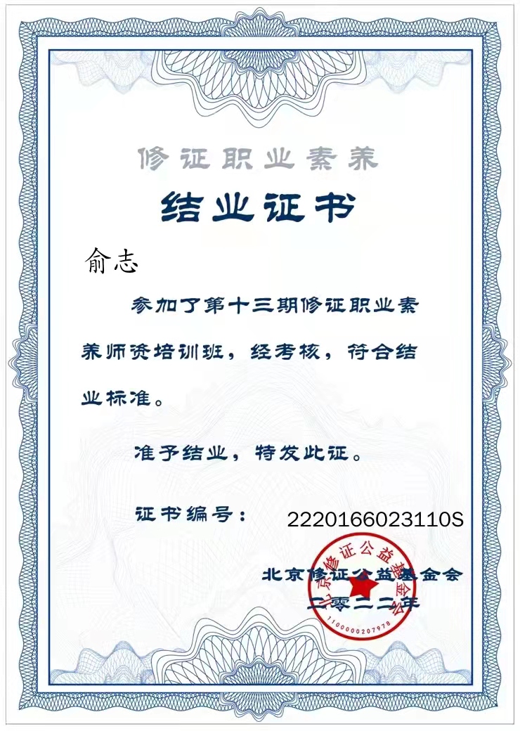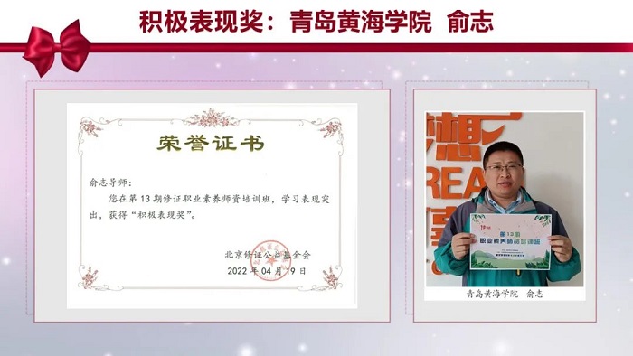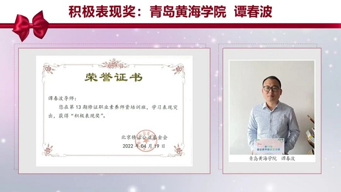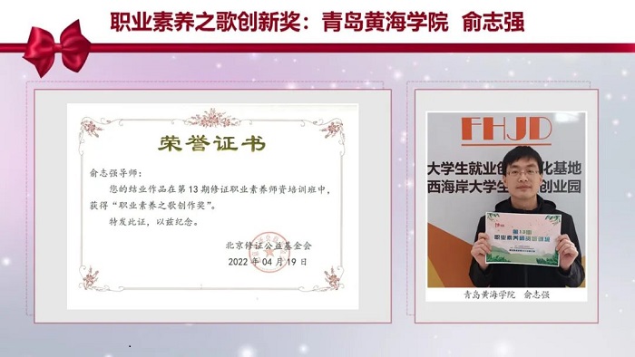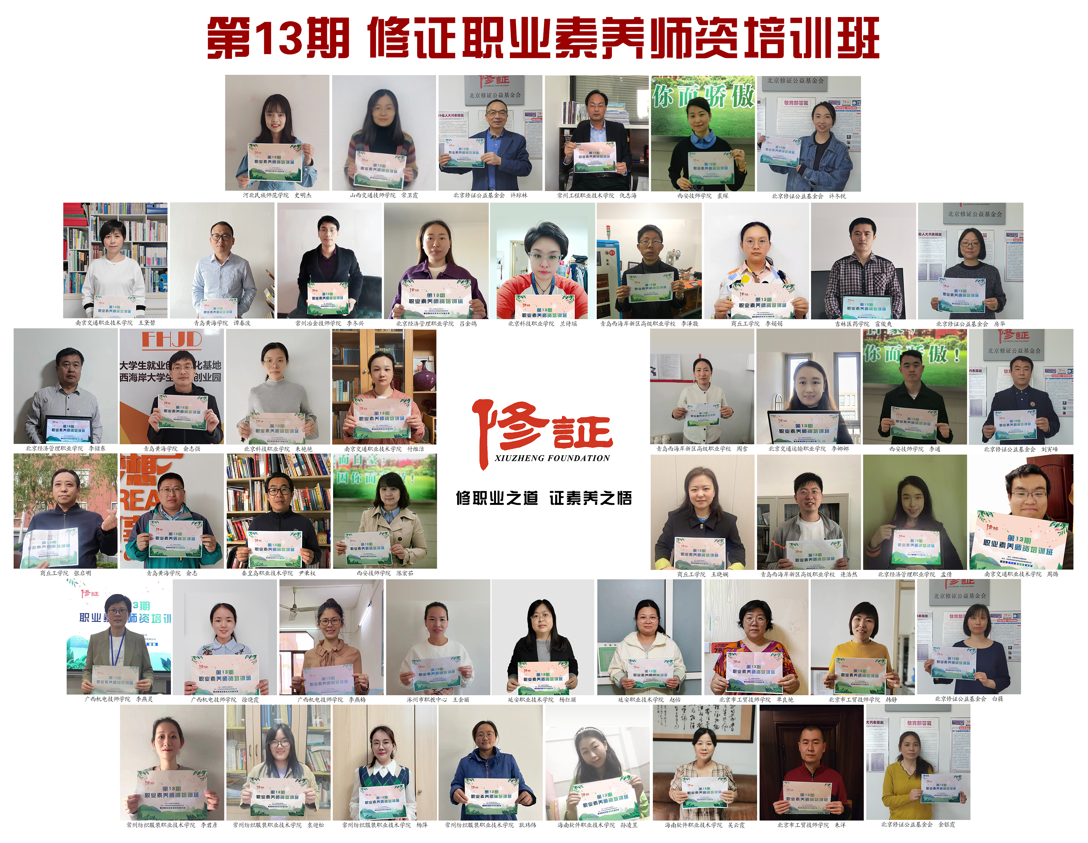 2022年4月10日—4月19日,由北京修证公益基金会主办、北京职场成功教育咨询有限公司承办的修证职业素养教育进院校工程“第十三期修证职业素养师资培训班”圆满完成,青岛黄海学院创新创业教育学院谭春波、俞志强、俞志三位老师参加了此次培训并喜获佳绩。