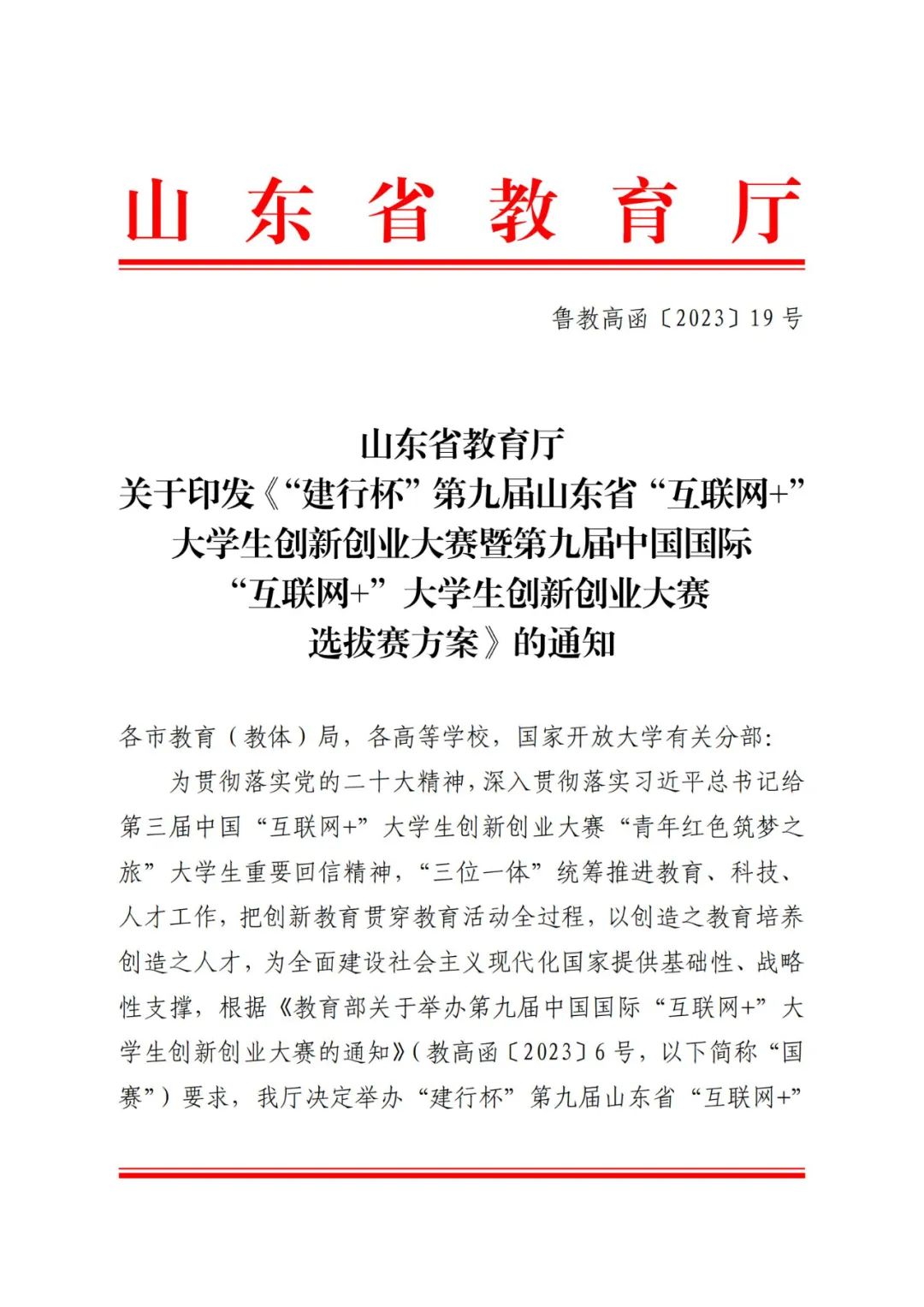 关于印发《“建行杯”第九届山东省“互联网+”大学生创新创业大赛暨第九届中国国际“互联网+”大学生创新创业大赛选拔赛方案》的通知