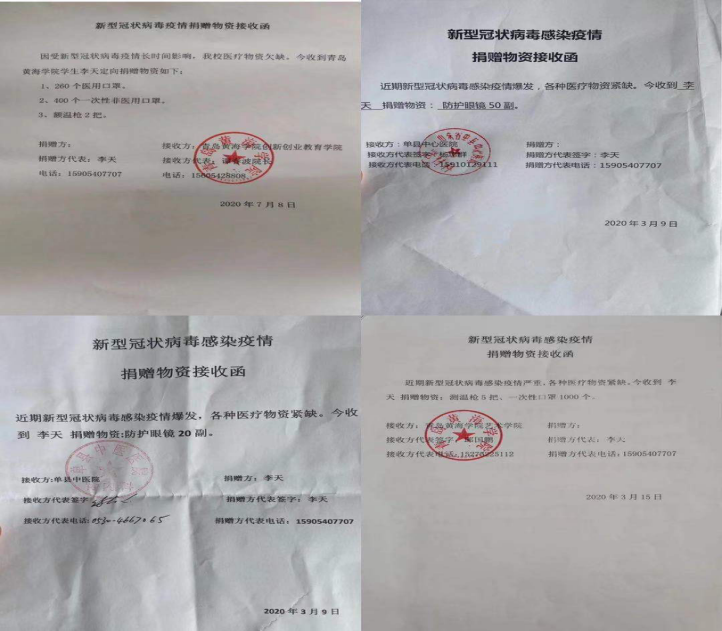 图4:李天同学及代表公司所捐赠防疫物资的部分证明
