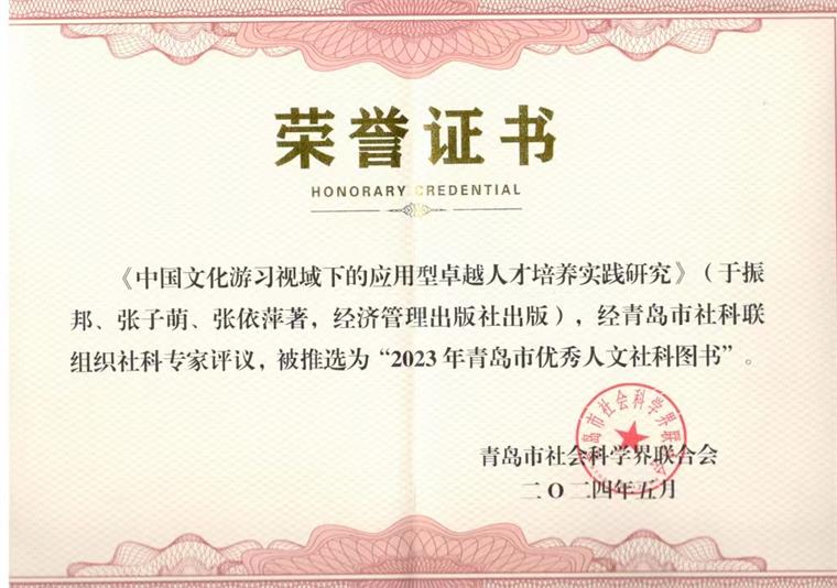 近期,创新创业教育学院收到青岛市社会科学界联合会下发的荣誉证书,我校于振邦老师撰写的《基于工作室的应用型本科创新创业教育模式研究与实践》和《中国文化游习视域下的应用型卓越人才培养实践研究》两部著作获得社科专家一致好评,均入选“2023年青岛市优秀人文社科图书”。