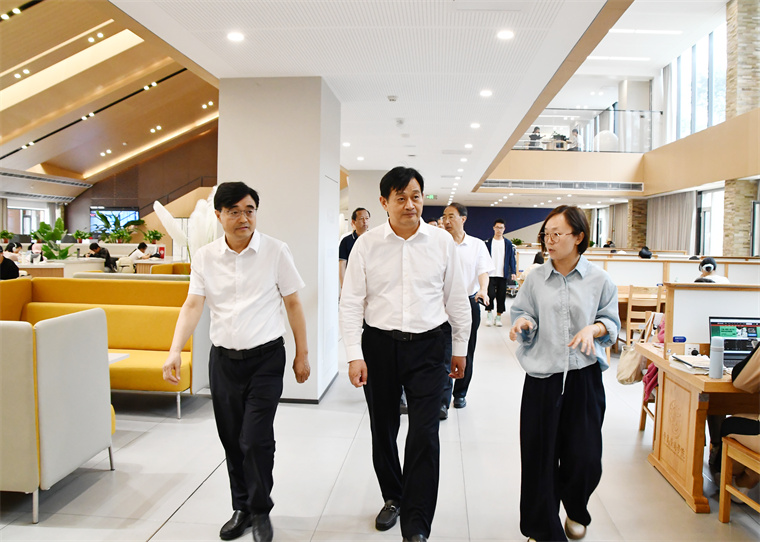 会前,赵胜村副市长一行在青岛黄海学院董事长刘常青陪同下参观了学校悦享空间、知信楼等场馆。