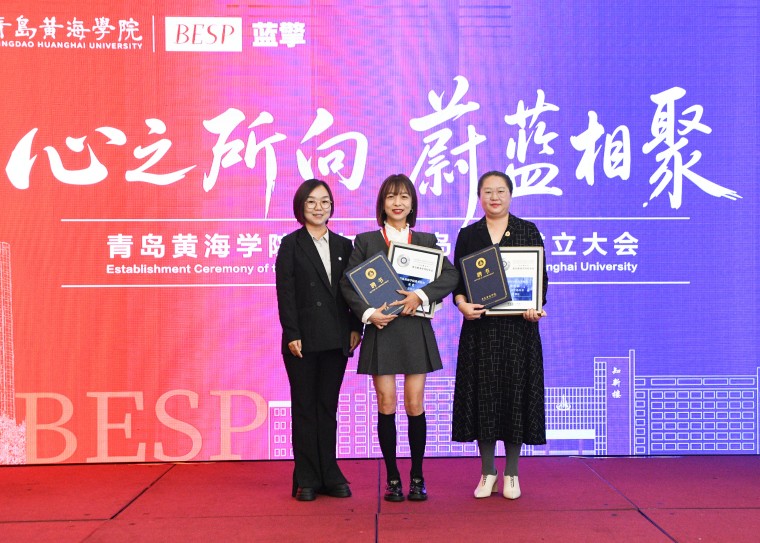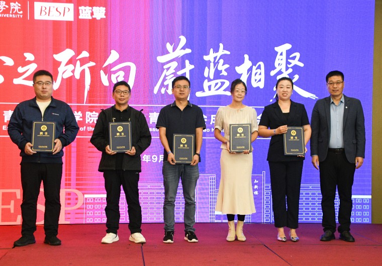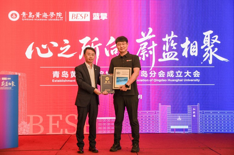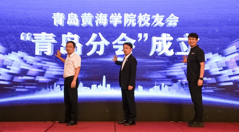 孟广东、李镇江等与会领导分别为新当选的会长、副会长、秘书长、副秘书长及理事颁发了聘书。在全场热烈的掌声中,孟广东、李镇江与新任会长韩青峰共同按下了象征分会正式成立的启动键,并为“青岛黄海学院校友会青岛分会”铜牌揭牌,标志着青岛校友从此有了正式的“新家”。
