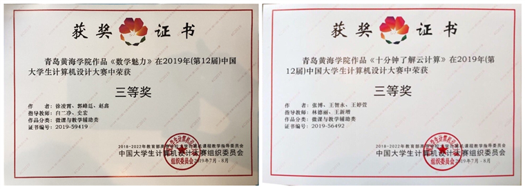 通过省级赛的激烈角逐、组委会推荐,我院两只参赛队均获得国赛参赛资格。经过评委专家的认真评审遴选,由白二净老师指导我院徐凌霄,郭峰延、赵鑫3位同学的作品《数学魅力》在网评阶段即获三等奖;由林德丽老师指导张博、王智永、王婷萱(学前教育学院)3位同学共同完成的作品《十分钟了解云计算》成功入围国赛现场,凭借出众的实力、精心的准备以及在现场演示和答辩环节中的稳定发挥,最终荣获大赛三等奖。