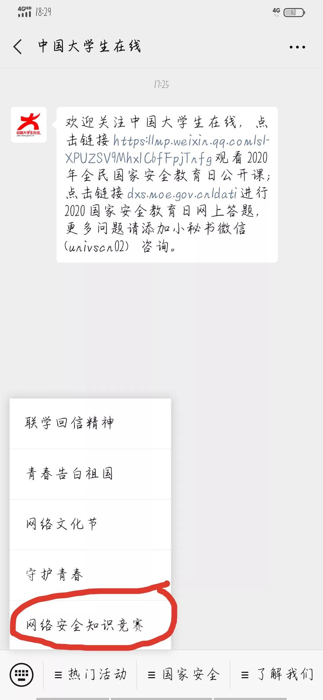 关注微信公众号“中国大学生在线”或登录http://dxs.moe.gov.cn/dati即可参加国家安全知识问答活动(线上国家安全知识竞赛15日开始)。