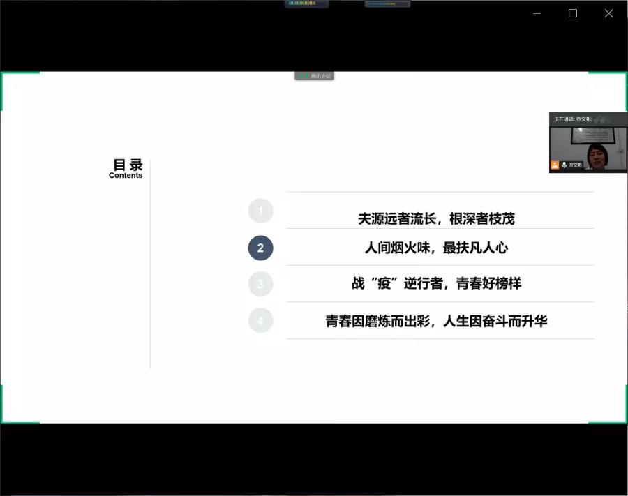 本次主题班团课主要从四个方面开展话题,分别是:夫源远者流长,根深者枝茂;人间烟火味,最扶凡人心;战“疫”逆行者,青春好榜样;用担当,奉献谱写青春华章。