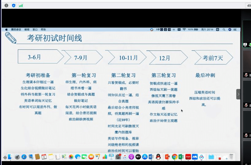 彭素静学姐的线上考研经验分享,主要分享了一年以后研究生的学习生活、未来的规划和每天的时间安排,其中研究生生活最重要的就是做研究、写课题和发论文。聊了最开心的事情就是奖学金、助学金,同时对我校考研的特点进行了简单的分析,并对选择考研这一出路提出自己的规划与建议。