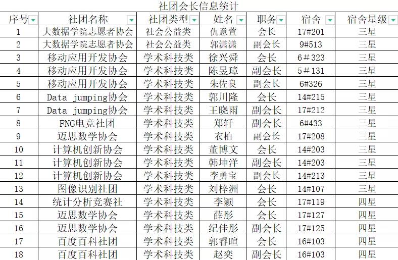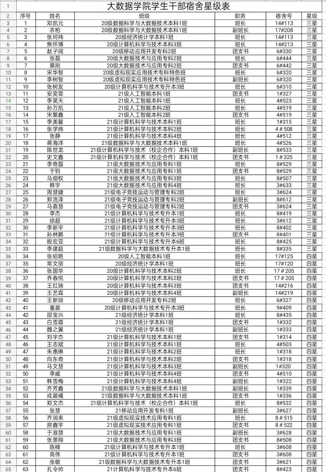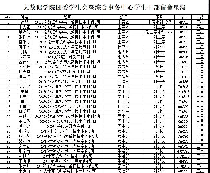 为方便学生干部工作了解学生会干部的宿舍情况,现公布11月学生干部星级宿舍以及优良学风宿舍。