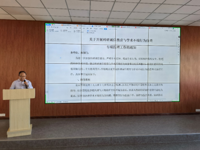 孙守强副院长从国家有关科研诚信政策及要求、常见学术不端行为及原因分析、学校维护科研诚信思路及措施等方面进行宣讲,带领老师们学习了《高等学校预防与处理学术不端行为办法》、《关于进一步加强科研诚信建设的若干意见》、《鲁教科发〔2022〕3号_山东省教育厅关于进一步加强高等学校科研诚信工作的意见》、《青岛黄海学院学术不端行为查处细则(暂行)》等政策文件。