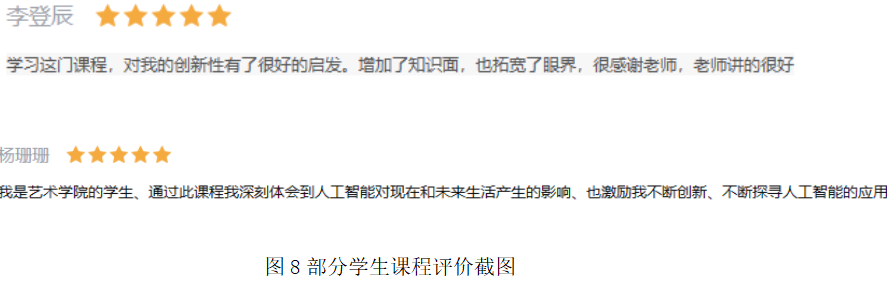 修读主体为本专科学生,选课学生对课程设计的系统性和条理性、教学内容的通识性和启发性、在线视频流畅度等方面予以了肯定,并表达了学习课程的收获,如通过学习该课程,了解了人工智能的应用领域、提高了对人工智能科技的学习兴趣、提升了人工智能+创新思维能力等。部分学生给予了肯定评价: