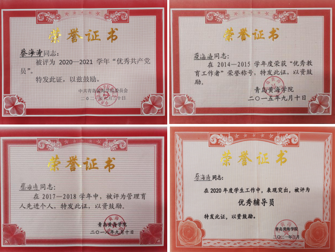 在从事忙碌的就业工作之外,蔡老师还担任学生日常管理和思想政治教育工作,作为一名高校辅导员,认真落实十大育人体系,帮助学生树立正确的世界观、人生观、价值观,引导青年学生将个人热情和抱负融入到祖国的建设中去,融入到实现中华民族伟大复兴的中国梦的伟大征程中去。所带班级两次荣获山东省优秀班集体,樊子月自愿援疆、扎根基层;李勇霖、王宏伟等本科毕业后参军报国、驻守祖国边疆;魏君龙等参加西部计划、为基层奉献青春;郑晓卫、王梓扬自愿留校、投身黄海教育事业……