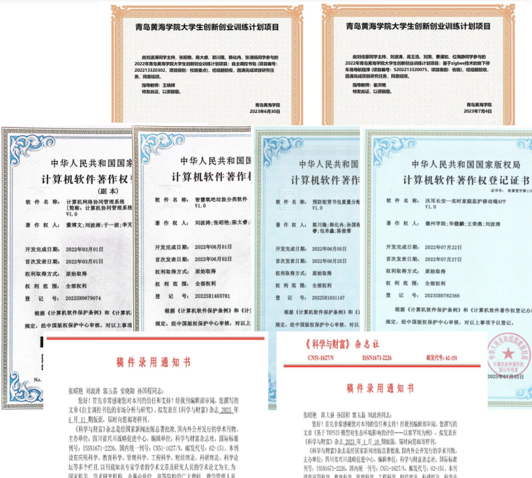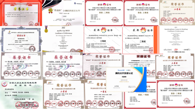 2022-2023学年,参加学科竞赛获国家级奖项5项,省级奖项14项,校级奖项2项;参与课题研究3项,其中省级课题2项,校级重点课题1项,申办相关软著3项,发表论文2篇。入校至今累计获得各类荣誉、奖项43项。