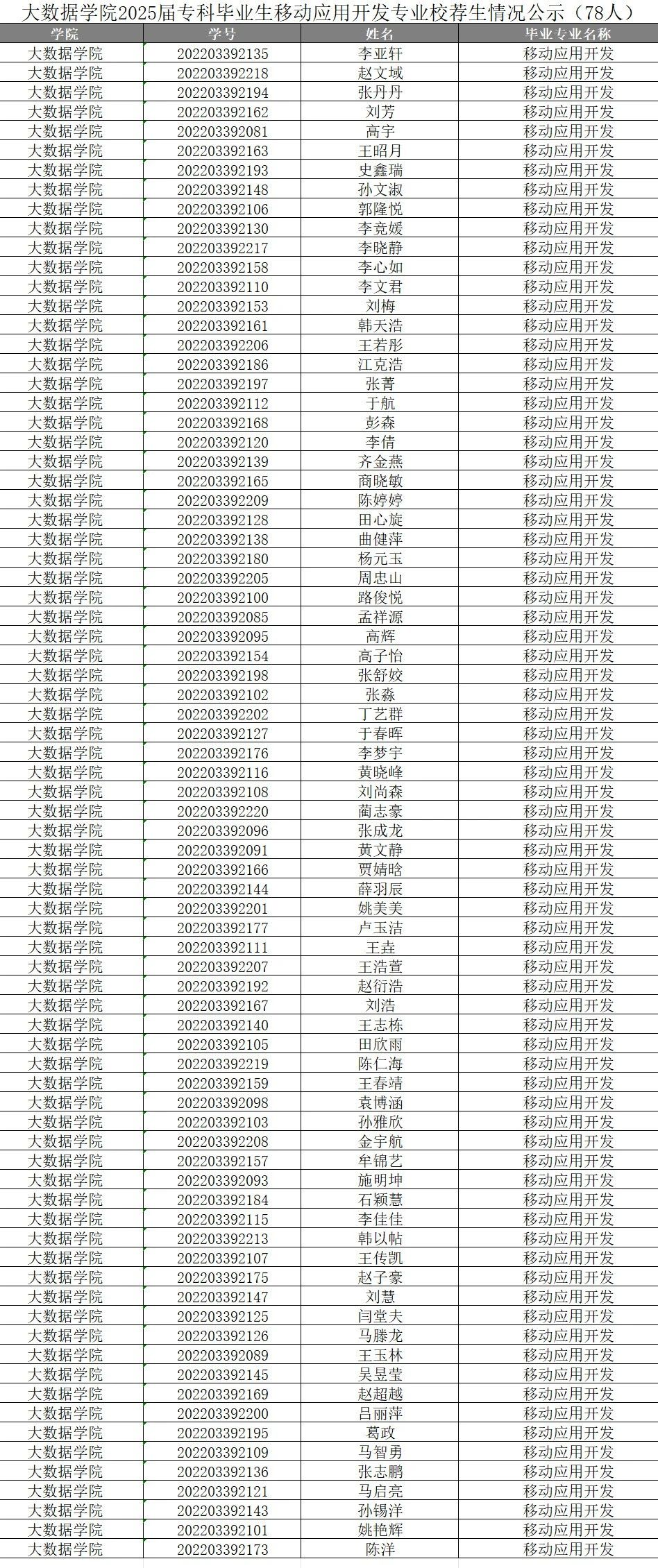 现将拟推荐王嘉慧等345名同学为2025届专科毕业生专升本校荐生,予以公示,排名不分先后。其中大数据技术专业153人,虚拟现实技术应用36人,移动应用开发专业78人,电子竞技运动与管理专业78人。