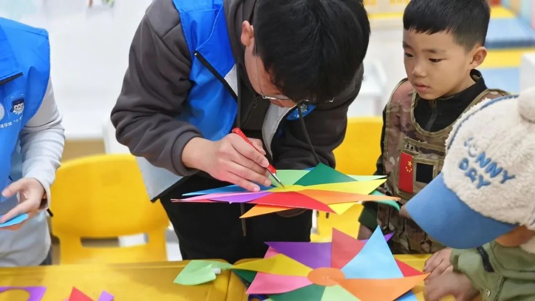 “哥哥,怎么让风车的叶片对齐呀?”在“风车手作课堂”上,小朋友们围坐在志愿者身旁,手中拿着彩色卡纸、小木棍等材料,跟着讲解步骤真地裁剪、折叠、组装。志愿者们耐心地指导着每一个细节,还细致地讲解风车的结构原理:“风车的叶片角度均匀分布,转动起来才会更平稳哦!”孩子们专注地调整着手中的叶片,眼神中满是对风车转动的期待。