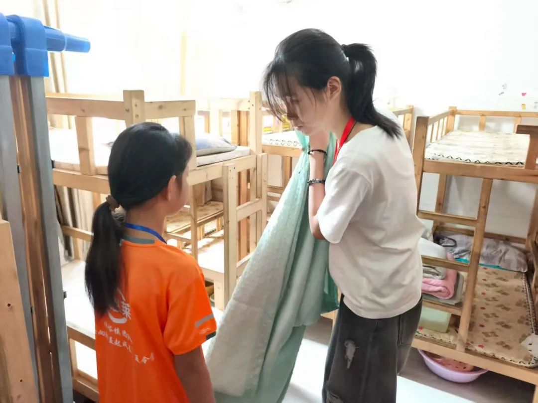 清早,孩子们起床后,志愿者带领孩子们整理内务,打扫宿舍卫生。志愿者们一边讲解要领,一边强调良好生活习惯的重要性。孩子们围在志愿者身边,睁大眼睛,认真学习着每一个步骤。从最初的生疏笨拙,到逐渐掌握技巧,汗水浸润了额角,但专注的神情却格外动人。当杂乱的床铺变得整洁有序,蒙尘的角落重现光亮,小小的宿舍焕然一新时,孩子们的脸上绽放出劳动后的满足与自豪。这不仅是一次环境的清洁,更是一次“自理能力”和“责任意识”的播种。志愿者们引导孩子们懂得,整洁的环境是舒适生活的基础,井井有条的习惯是迈向自立的第一步,爱护自己的“小家”,方能更好地拥抱广阔的世界。