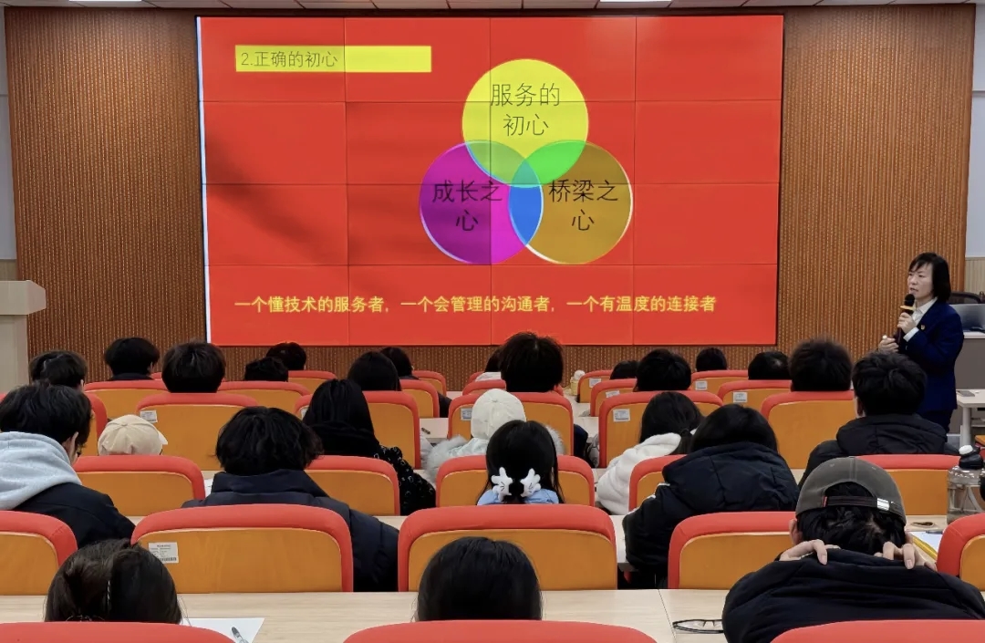 讲座开始,院长助理齐林以新时代学生干部的初心为切入点,紧密结合高校学生工作的发展态势与实际案例,筑牢求真务实思想根基。其中,齐林老师着重强调,学生干部应有正确的初心,从服务、成长到桥梁这三个角度各自出发,成为懂技术的服务者、会管理的沟通者、有温度的连接者。