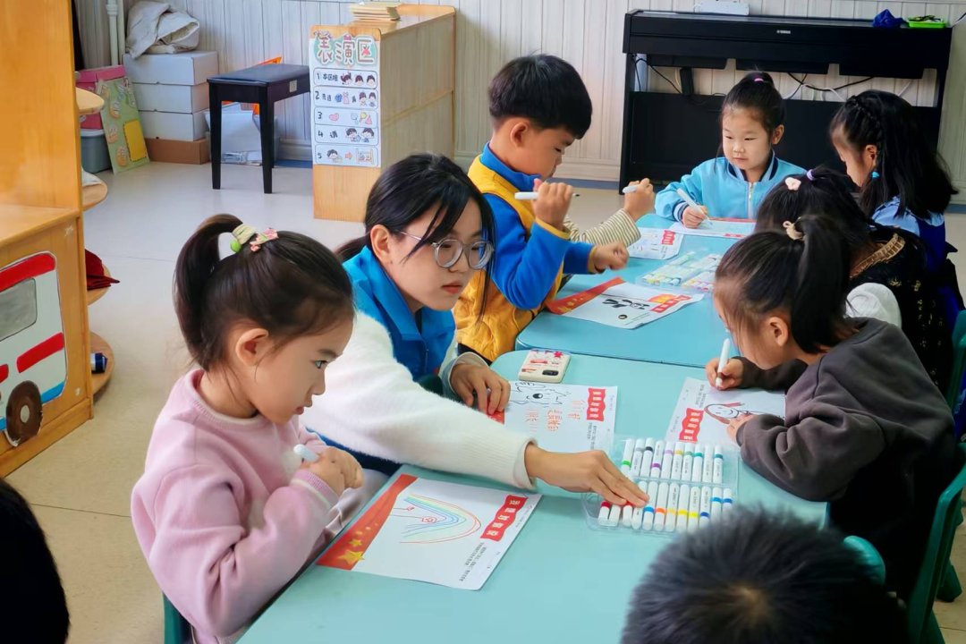 在动手实践环节,小朋友们迎来了一场独特的情感表达之旅,他们将借助画笔的力量,在《我想对你说》作业单上绘制出对志愿者的敬意与感激。现场的氛围瞬间被点燃,孩子们的热情如同高涨的潮水,一波接着一波。他们纷纷像欢快的小鸟,拿起手中的画笔,在作业卡上开始了他们的心灵创作之旅。那一笔笔稚嫩的画作,恰似一扇扇通往孩子们内心世界的窗户,透过它们,可以清晰地看到孩子们对志愿者们满满的敬意,以及对祖国母亲那纯粹而炽热的热爱。每一道线条,每一抹色彩,都仿佛在无声地诉说着孩子们质朴无华却又真挚深沉的情感,而在这创作的奇妙过程中,爱国深情也如涓涓细流,悄然滋润着他们幼小的心灵。