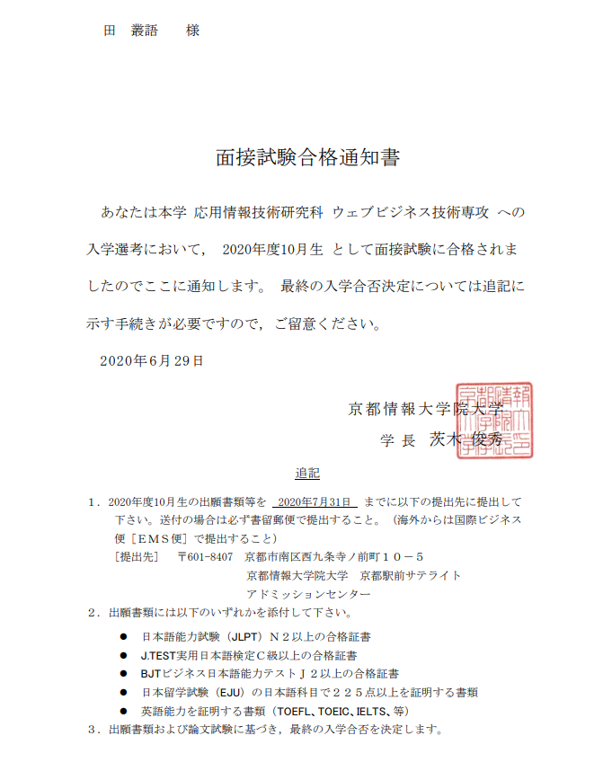 留学经历:田同学利用大三校外实习时间学习日语,一年时间从零基础考到N2,成功申请京都情报大学院大学,实现了由专科到硕士的逆袭。由于疫情,自2020年10月日本院校开学以来一直进行线上学习,紧锣密鼓,丝毫未耽误学业,田同学计划于今年6月份赴日进行毕业答辩,将于9月正式取得日本京都情报大学院大学信息技术硕士学位证书。