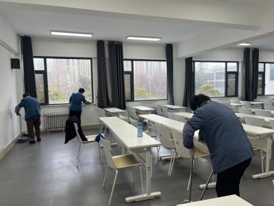 保洁班组全力开展教室撤清、地面冲刷清污工作,启用专业清洗设备,对校园西区等区域进行全方位清洁保障,让教室及公共区域焕然一新。