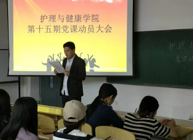 护理与健康学院党总支于2018年5月9日19:00在四号教学楼218教室召开第十五期党课动员大会。本次会议由护理学院党总支书记王芝发同志主持,组织委员张茂文以及我院第十五期党课培训班37名师生参会。
