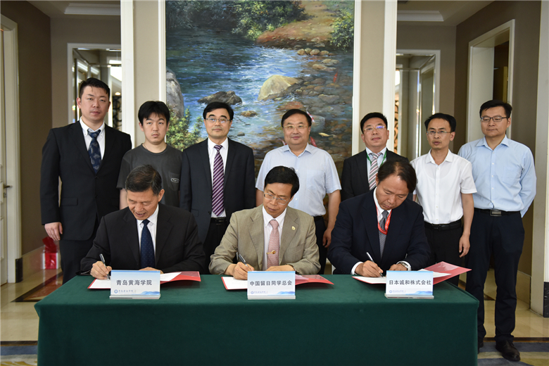 签约仪式上,中国留日同学总会会长汪先恩、青岛黄海学院校长王渊明、日本诚和株式会社社长河本一志共同签订《中日青岛健康养老产学研基地战略合作协议书》。青岛西海岸新区工委(黄岛区委)常委、组织部部长、区委教育工委书记逯鹰、青岛西海岸新区招才中心副主任胡志鹏、青岛黄海学院董事长刘常青等鉴签。