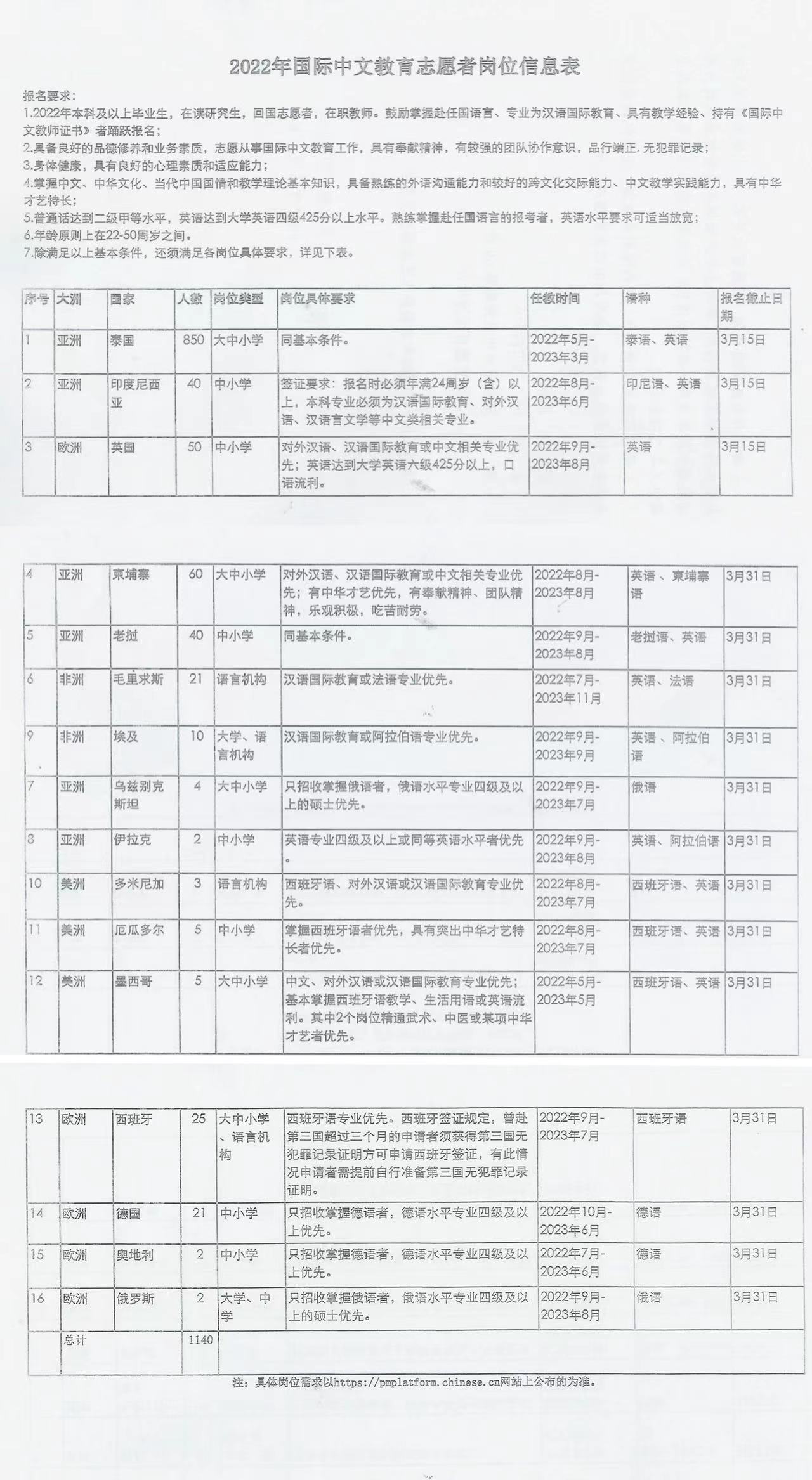 全年面向全国各类学校招募约1140名国际中文教育志愿者,岗位涉及泰国等16国。岗位信息详见附件。