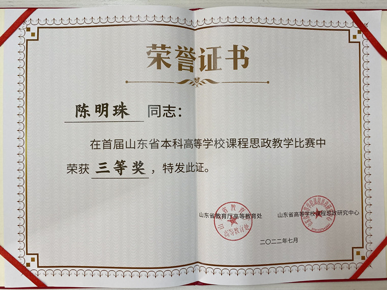 2022年7月,山东省首届山东省本科高等学校课程思政教学比赛,我院陈明珠老师喜获三等奖。