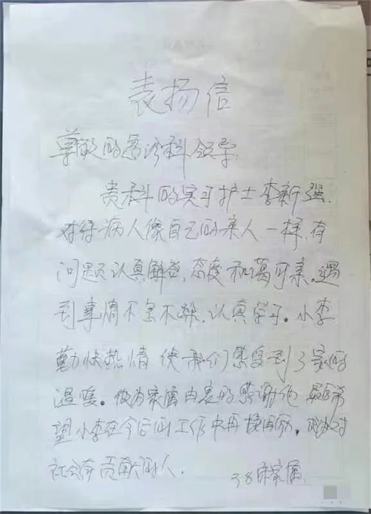 2019级护理学本科2班李新强同学在急诊科病房收到38床患者的表扬信