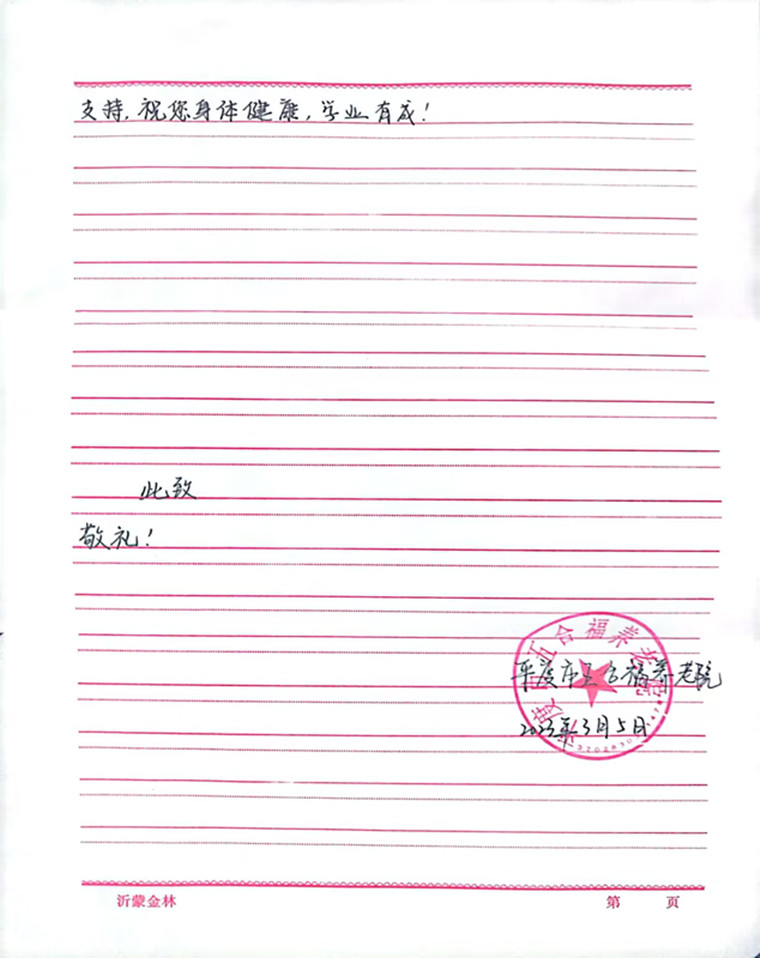 近日,青岛黄海学院收到了一封来自平度市五合福养老院全体工作人员的亲笔感谢信。字里行间里表达了对我校护理与健康学院曹莉莎同学在养老院期间爱老助老行为的感激和肯定,感谢她用耐心、爱心给老人们带来了无限的欢乐和温暖。
