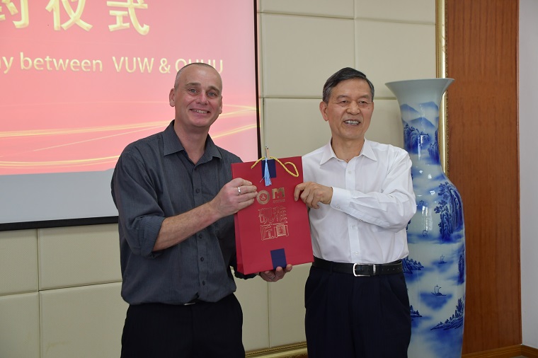 会谈结束,梁忠环副校长代表学校与惠灵顿维多利亚大学共同签署了合作备忘录及短期留学项目合作协议,王渊明校长代表学校与代表团成员互赠礼物,并与代表团成员合影留念。