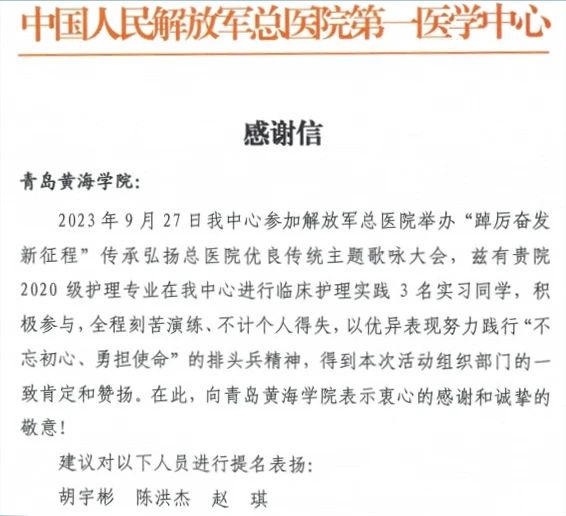 近日,青岛黄海学院收到一封来自解放军总医院第一医学中心护理部的感谢信。信中对青岛黄海学院医学院2020级护理学本科2班的胡宇彬、陈洪杰、赵琪3名同学在参加解放军总医院举办的“踔厉奋发新征程”传承弘扬总医院优良传统主题歌咏大会中的优异表现给予了充分肯定和认可,赞扬他们积极参与,全程刻苦演练、不计个人得失,以优异表现努力践行“不忘初心、勇担使命”的排头兵精神。他们的努力得到了相关部门的一致肯定和赞扬。