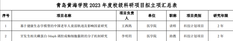 附件:青岛黄海学院2023 年度校级科研项目拟立项汇总表