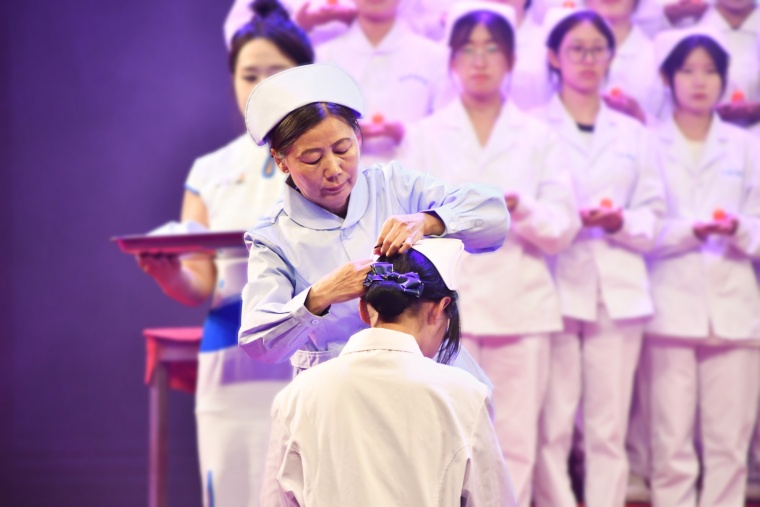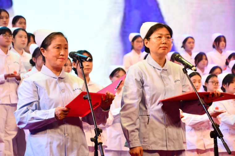 在庄严神圣的授帽仪式上,由院长助理綦盛楠带领教授们为学生代表戴上圣洁的燕帽。全体学生手捧烛台,在南丁格尔塑像前庄严宣誓,继承和弘扬南丁格尔不畏艰险、甘于奉献、救死扶伤、勇于献身的人道主义精神。
