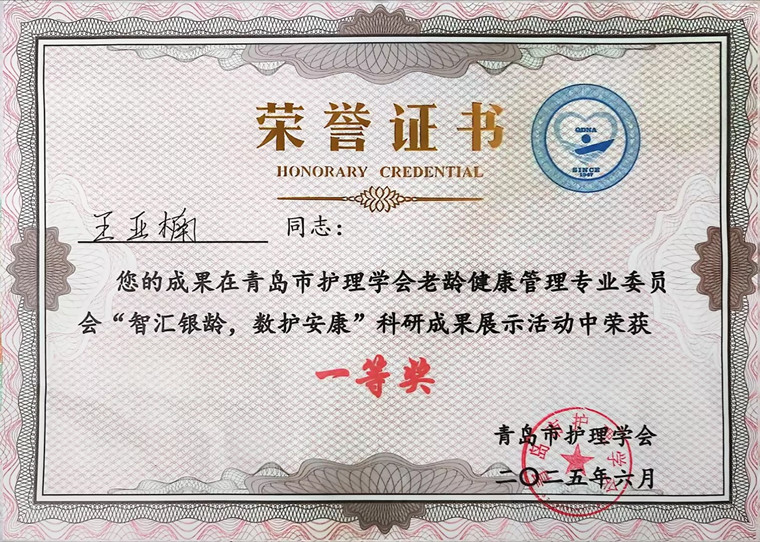 6月20日,喜讯传来!我院王亚楠老师凭借其在中国老年人健康领域的卓越研究,在青岛市护理学会老龄健康管理专业委员会举办的“智汇银龄,数护安康”科研成果展示活动中荣获一等奖!