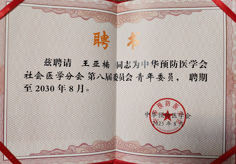 2025年8月11日至12日,中华预防医学会社会医学分会2025年学术交流会在江苏南京隆重召开。本次会议以“社会医学前沿探索:多学科合作,筑健康未来”为主题,聚焦学科发展前沿与时代命题,来自全国高校、科研机构及医疗疾控系统的青年才俊亦展示了上百项研究成果,交流实践经验,共探创新方法。我校医学院学科带头人郭继志教授与王亚楠老师共同参会,并在大会上汇报展示了两篇学术论文。王亚楠老师在本次会议上被正式聘任为中华预防医学会社会医学分会第八届委员会青年委员。