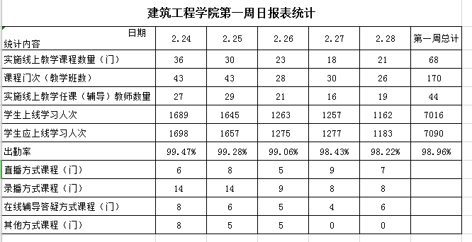 开学第一周,按照原定的教学计划,我院共开设170门次在线课程,涉及专、兼职在线直播、录播、辅导答疑教师数为44位,本、专科课程开设门数68门,实际上线学生数为7016人次,应上线学生数为7090人次,上线率为98.96%。