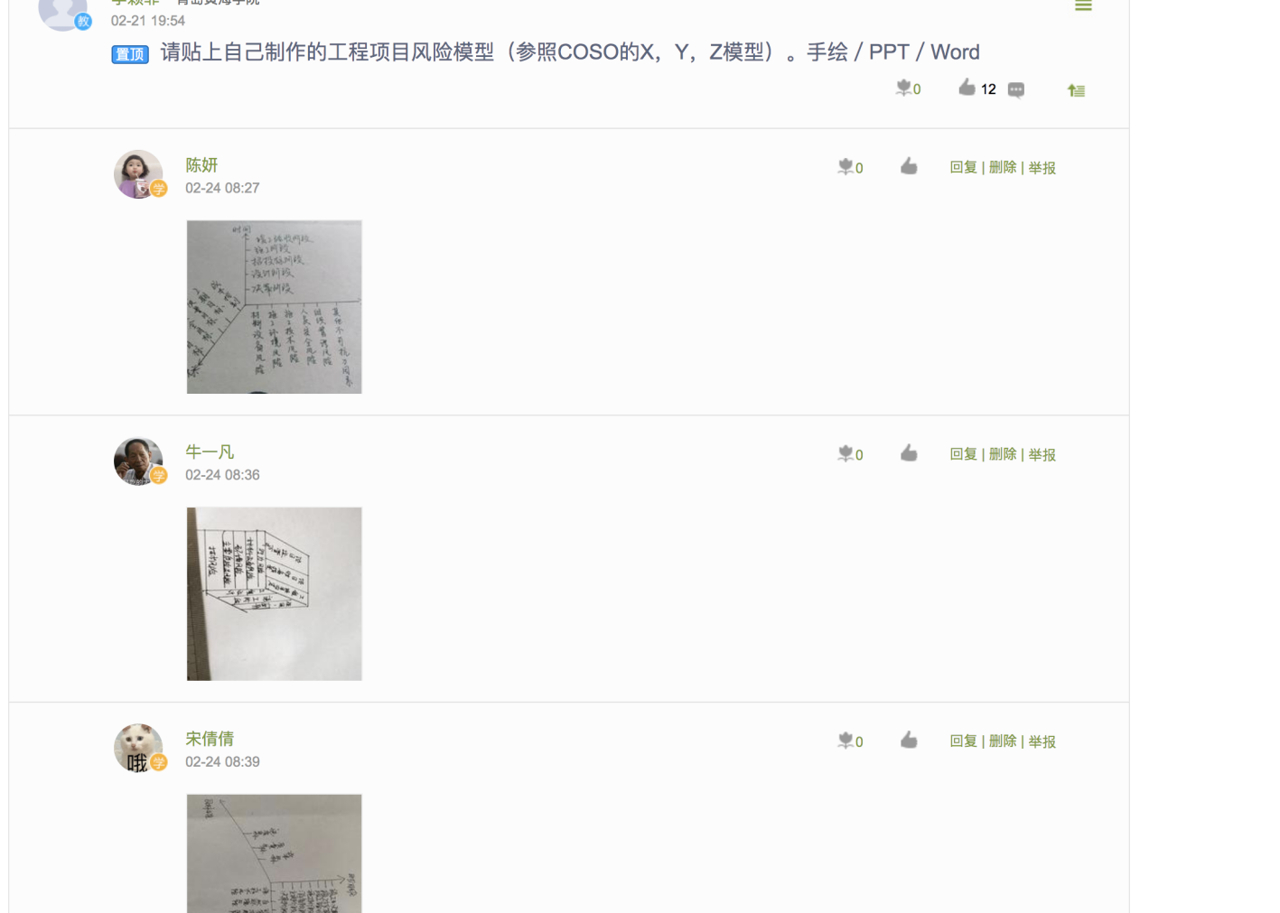 选择任务发布+参与讨论+群聊答疑的教学方式。以风险管理发展历程这一章节为例。
