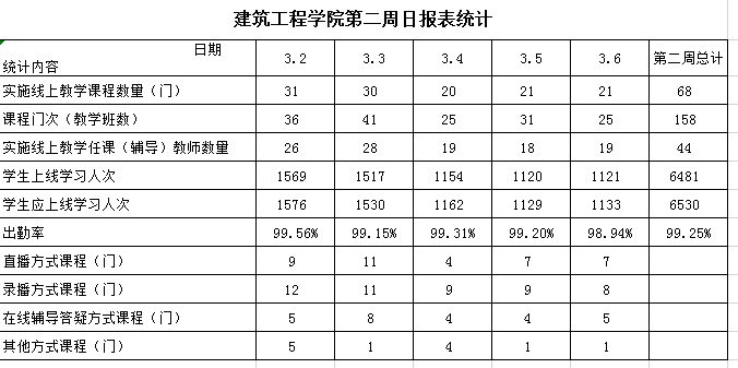 开学第二周,按照原定的教学计划,我院共开设158门次在线课程,涉及专、兼职在线直播、录播、辅导答疑教师数为44位,本、专科课程开设门数68门,实际上线学生数为6481人次,应上线学生数为6530人次,上线率为99.25%,比上周有所提高。