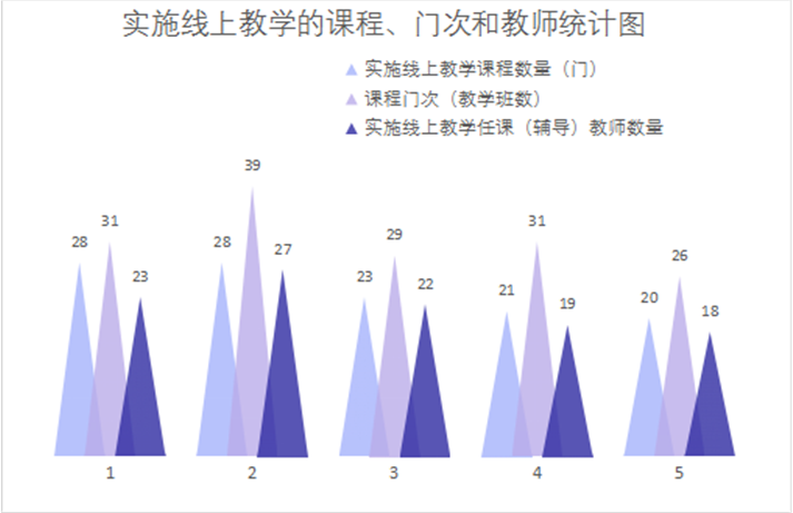 1、其中本周详细实施线上教学课程数量、课程门次和线上任课教师数量统计图如下: