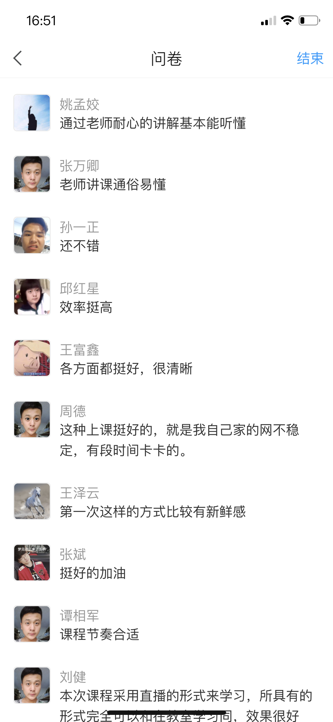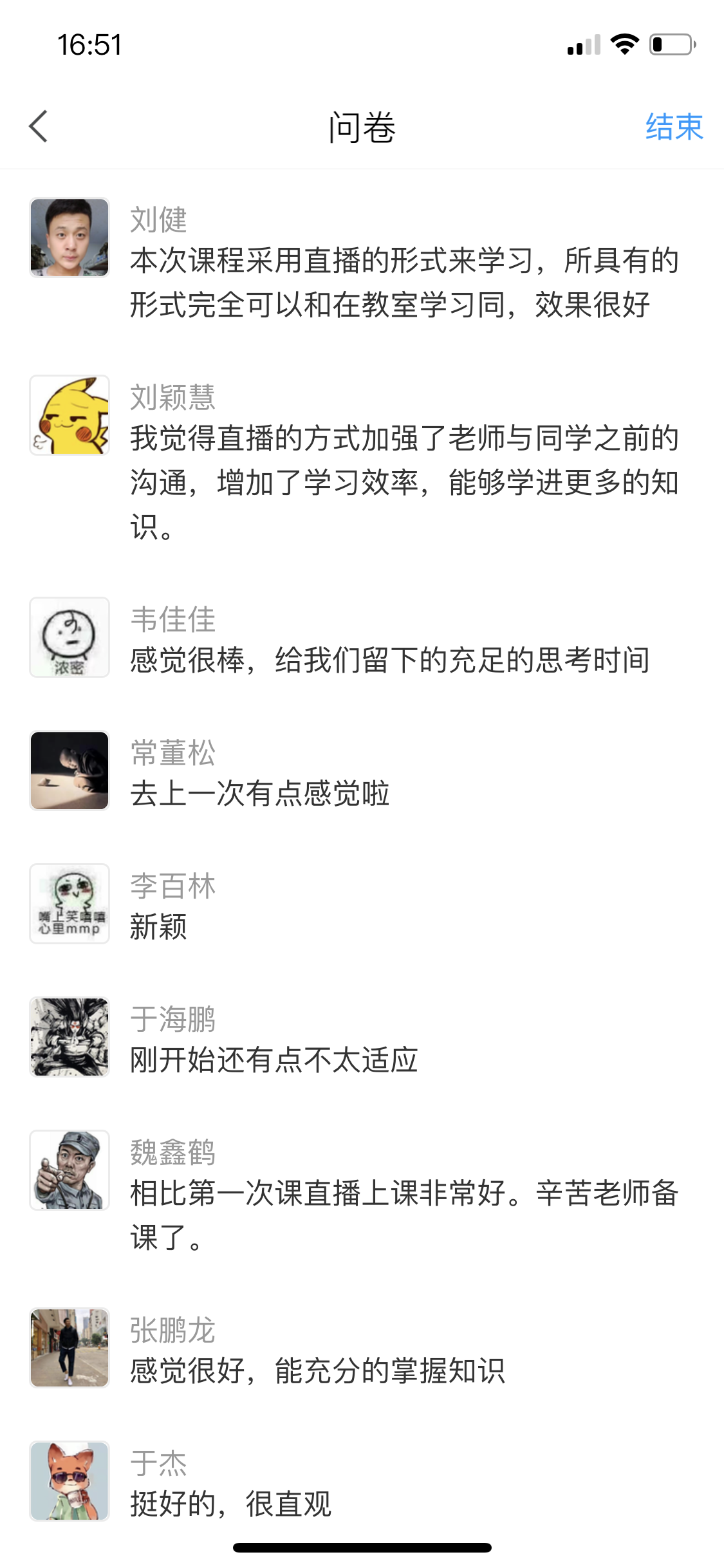 课后反馈:问卷调查显示所有同学表示这种直播的方式很好,更能集中精力,效果好