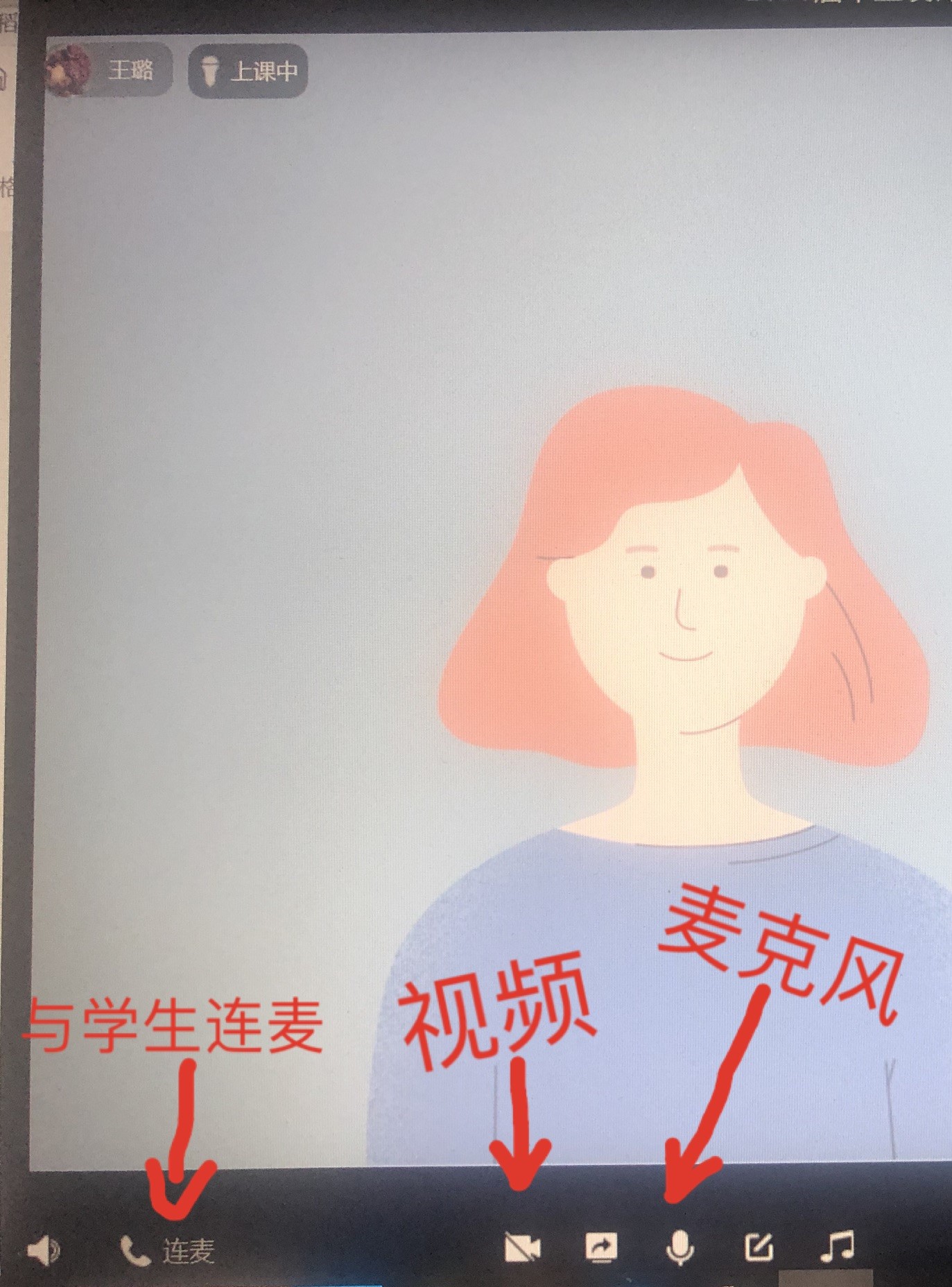 (5)麦克风、视频、连麦选项都在屏幕下面,根据需要打开,其中连麦是需要学生申请,你可以选择让谁来回答问题,学生的回答全班都可以听见。