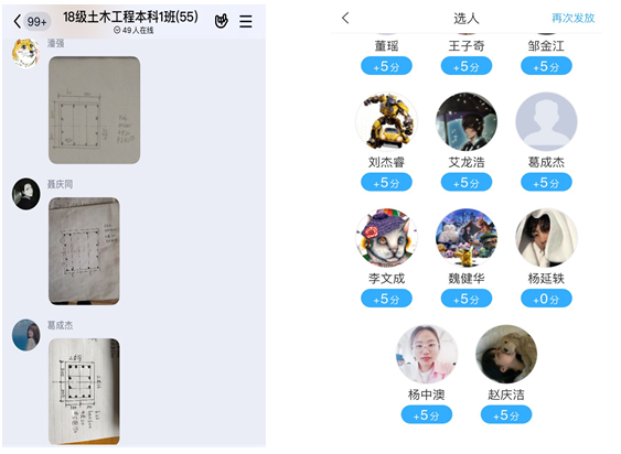 在练习的过程中,如果是读图,我会用学习通选人进行连麦来读图,读的好的适当加分,读的不好的也会减分。如果是画图,会让学生截图传到群里,也会对画图正确的同学进行加分,因为课堂互动占比15%,所以学生学习的积极性非常高,如图6。在这个过程中对于读图和画图都可以现场点评,学生会很快知道问题的所在,并及时纠正,在后续的练习中也会越来越好,最终掌握识读图纸的技巧。