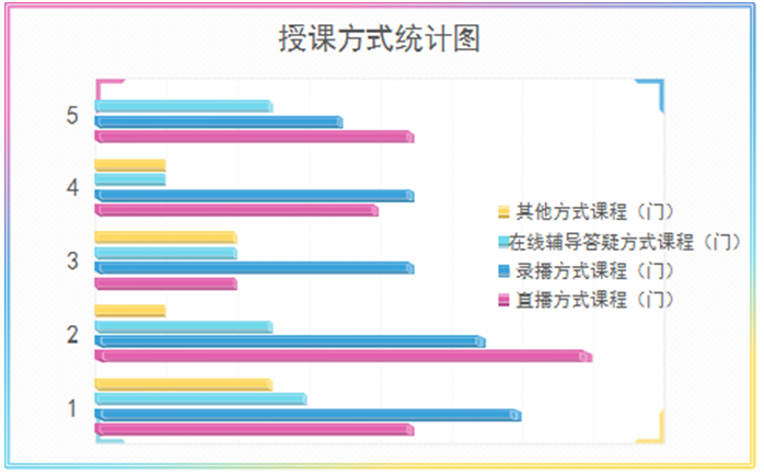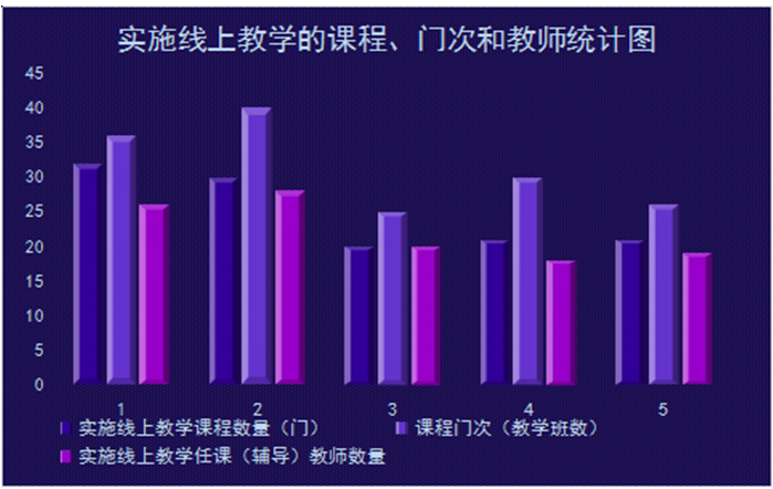 1、其中本周详细实施线上教学课程数量、课程门次和线上任课教师数量统计图如下: