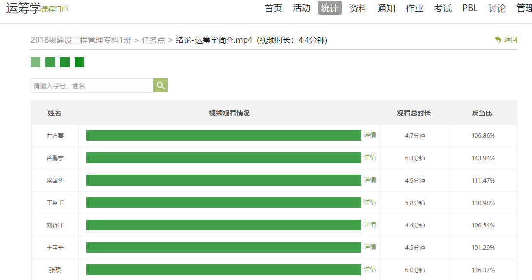 一节课完后学习通会在任务点显示各个学生的完成情况,根据统计来看一般情况下,大约90%的学生能够完成视频的观看,大约2-3%的学生为观看视频,7%的学生未看完,对于这10%的学生,截图发到群聊里或私聊督促其完成。