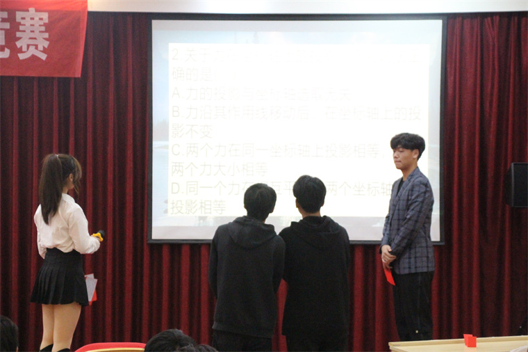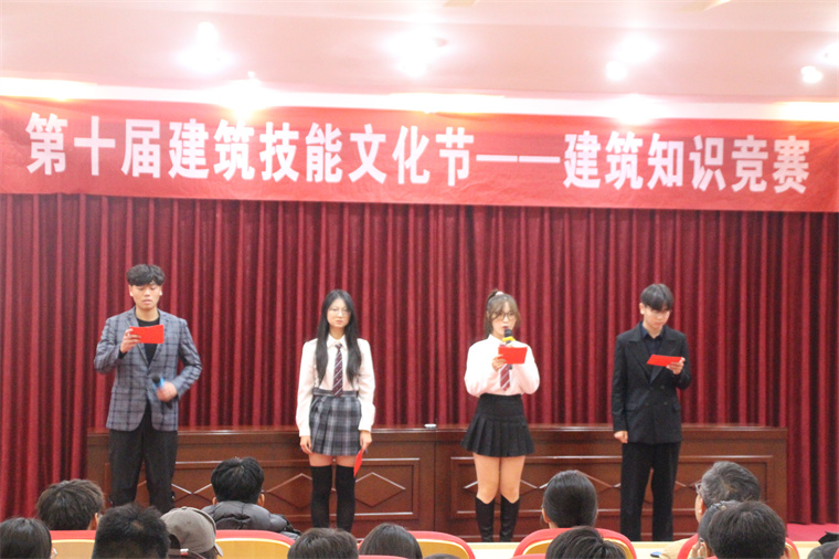 此次竞赛涉及建筑结构、工程制图、给排水、建筑材料、施工组织与管理、测量、钢筋混凝土结构设计原理等建筑施工类专业知识。各队参赛选手个个思如泉涌,对答如流,展现出他们对建筑充分的了解以及深厚的知识积累,营造了良好的竞赛氛围。为增强趣味性,比赛还设置了娱乐环节,两位同学为我们带来了优美的歌曲,现场氛围热烈而活跃,在缓解比赛紧张气氛的同时舒缓了参赛选手紧张的心情。