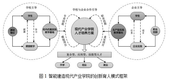 将学校主导的传统“课堂教学+仿真实践”的人才培养模式,企业主导的“任务驱动+真实项目”生产型实践教学基地的人才培养模式有机融合,如图1所示,构建智能建造现代产业学院的创新育人模式。