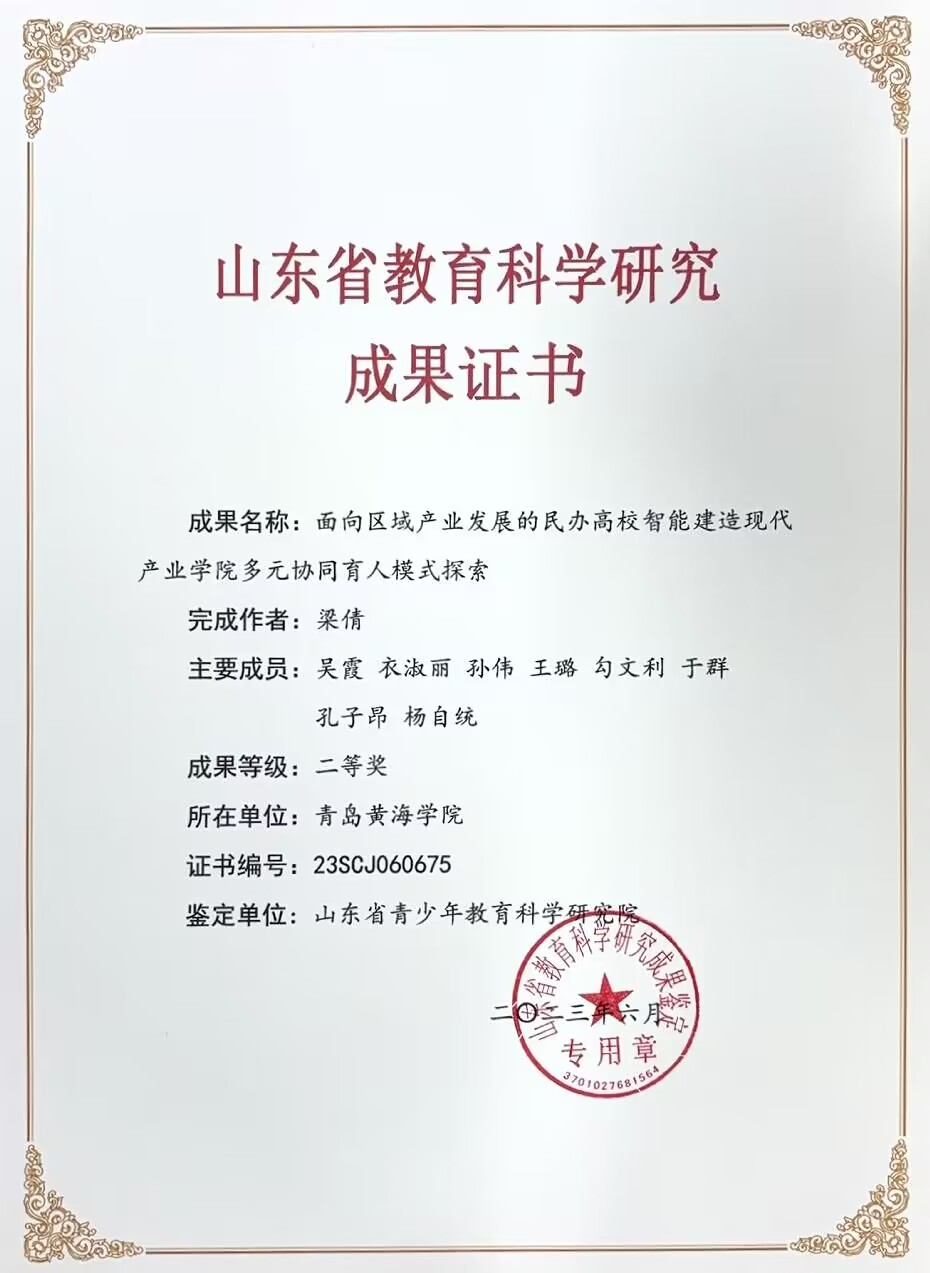 面向区域产业发展的民办高校智能建造现代产业学院多元协同育人模式探索项目于2023年6月结题,鉴定等级良好,并荣获研究成果二等奖,如图3所示,为后续工作开展奠定良好基础。