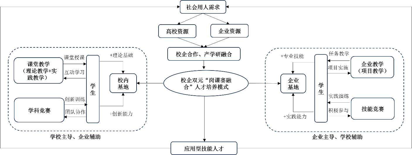 通过学校、企业两个基地平台,优化人才培养要素,打造“课堂教学—企业教学—学科竞赛—技能竞赛”融合的校企双元“岗课赛融合“人才培养模式,校企联动着力培养学生工程意识、实践动手能力和创新创业能力。